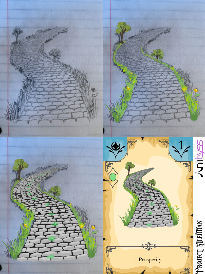 The artwork for a card starts with a prompt that I write, trying to capture what I envision the card art to look like. The prompt for the image shown was “a road laced with green crystals to prevent it from wearing.”