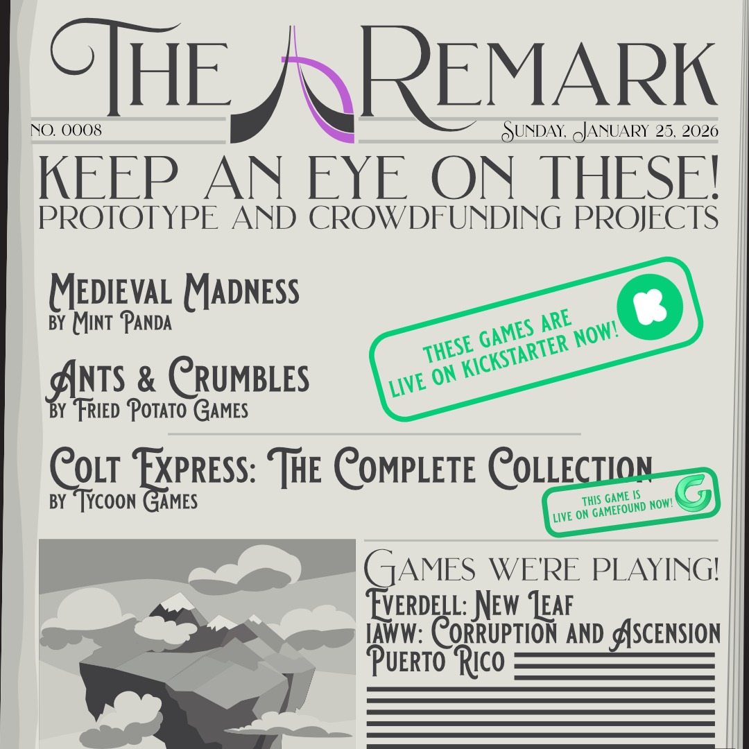 Ants & Crumbles (Fried Potato Games) – this project is live on Kickstarter until February 19th! The theming of this game is just plain fun and it looks like it would be a fantastic 30 min start to a board game night that might lead to rematch after rematch when your ant colony crumbles and you need revenge.
